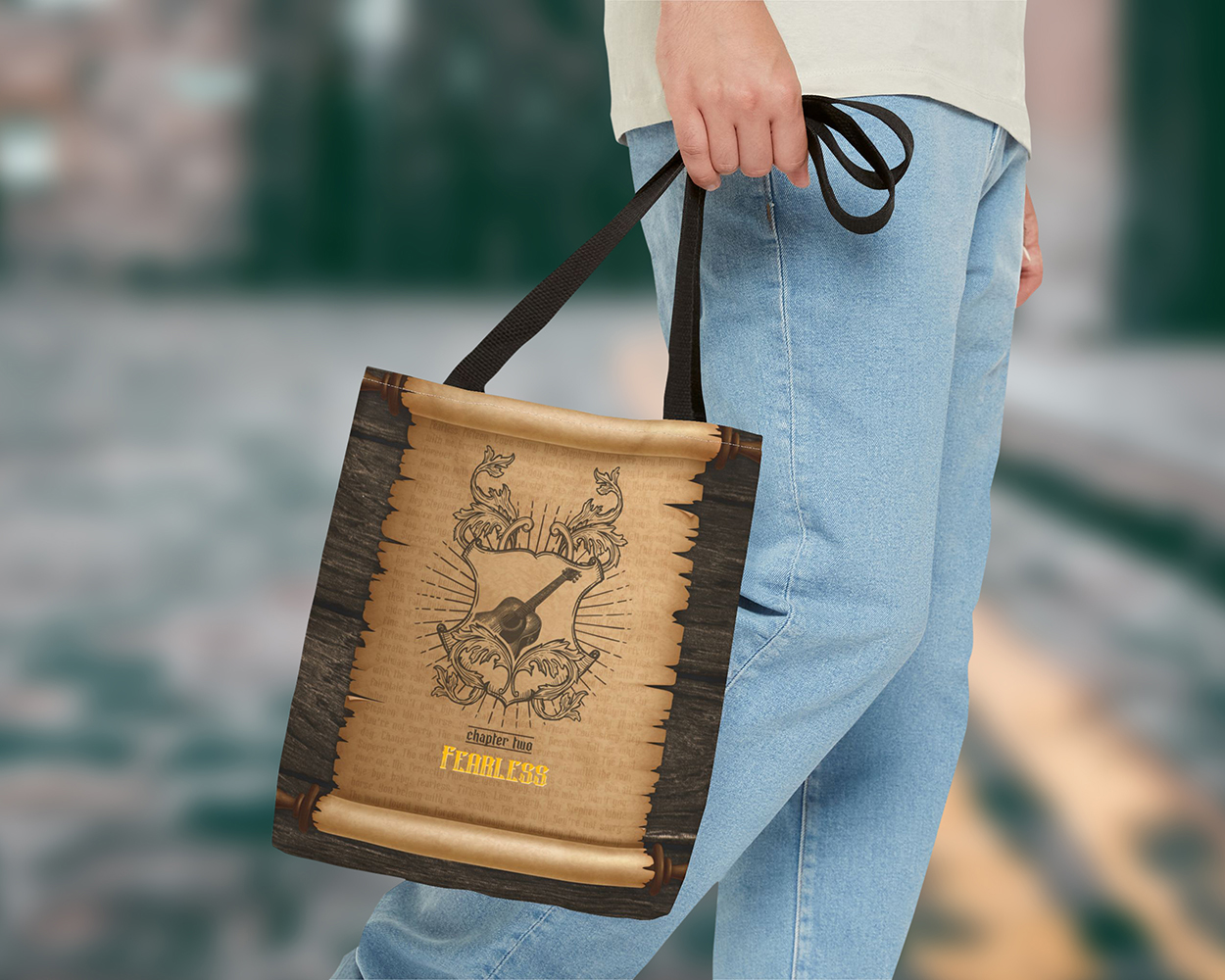 Distinctive tote bag, music merch, gift, and accessories. All-over print fabric bag.