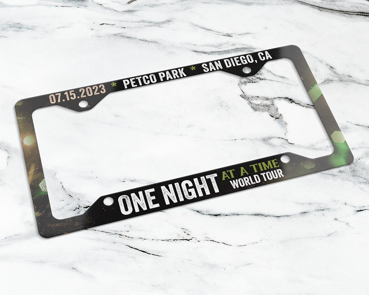 Choose your tour date, venue, city, state (or country), and get them printed on your license plate frame.