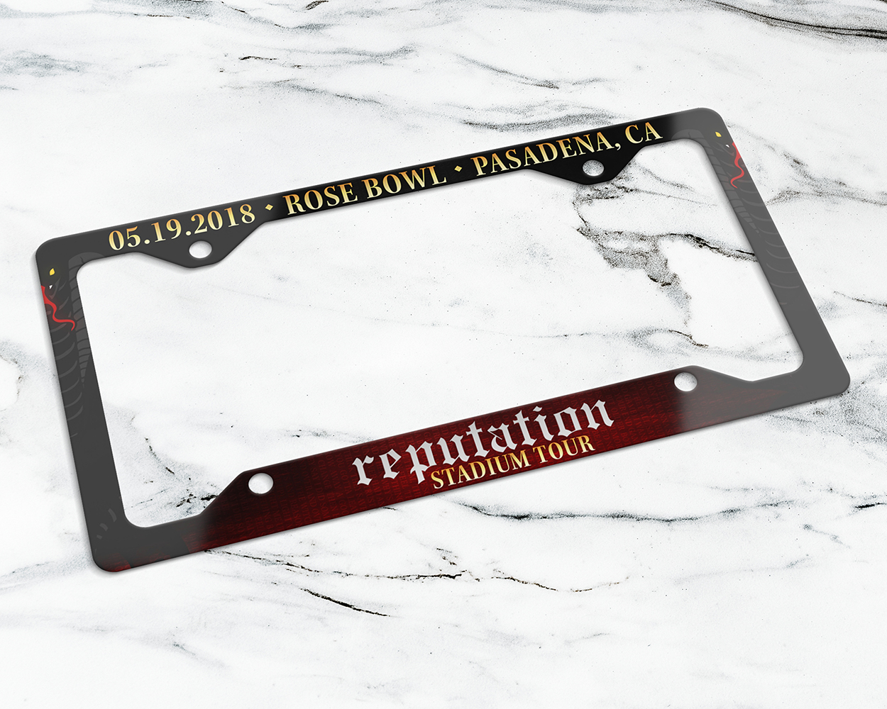 Choose your tour date, venue, city, state (or country), and get them printed on your license plate frame.