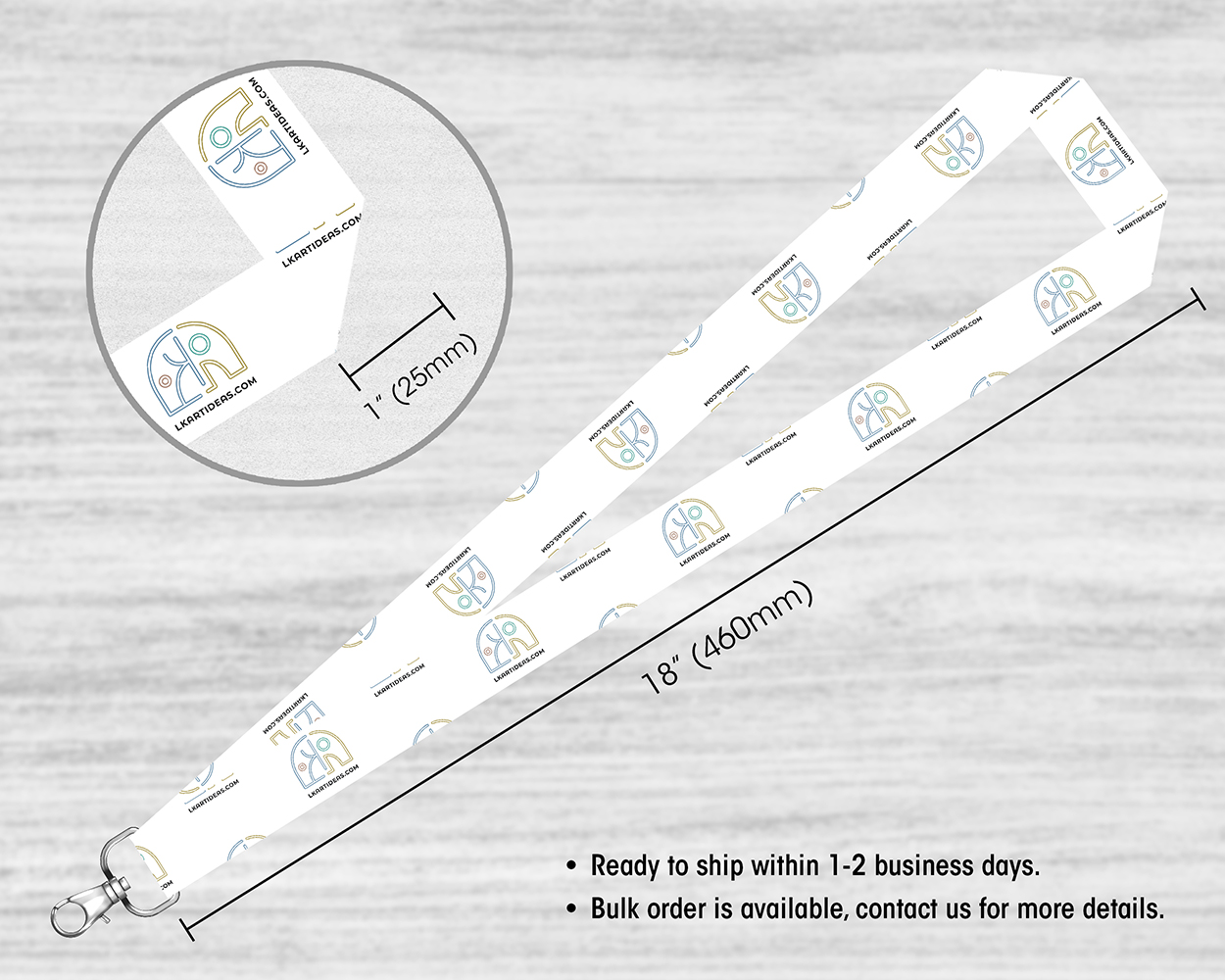 The lanyard is 1″ wide and 18″ long with a lobster claw hook.