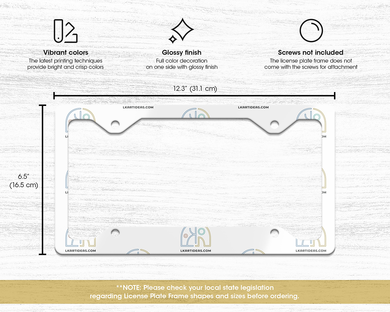 **NOTE: Please check your local state legislation regarding License Plate Frame shapes and sizes before ordering.